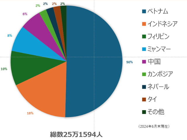特定技能1号の在留外国人は総数25万1594人、その内ベトナム人が50%となっており、次いでインドネシア18%、フィリピン10%となった。技能実習生と同じくベトナム人が圧倒的多数を占めている。