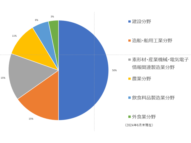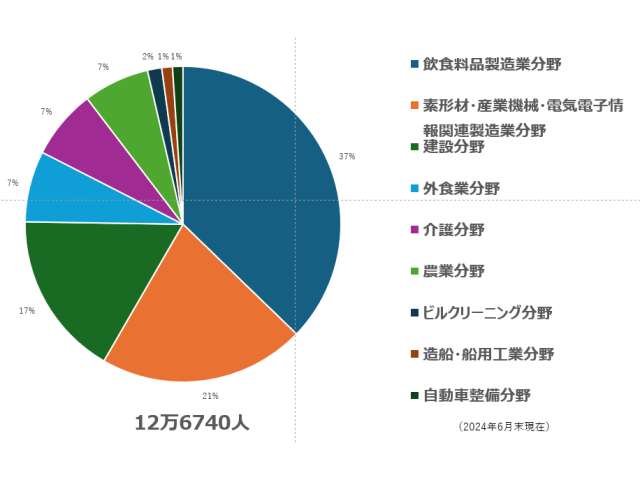 50%を占めているベトナム人が務めている先の産業分野は、「飲食料品製造分野」37%、「素形材・産業機械・電気電子情報関連製造業分野」21%、「建設分野」17%の上位3分野で75%を占めている。