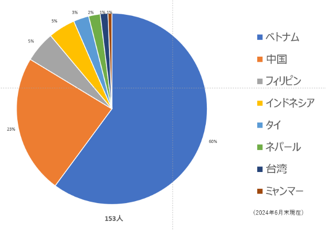 2024年6月末の特定技能2号の在留外国人は総数153人、その内ベトナム人が60%、中国人が23%となっており、2号もベトナム人が多い。これから2号受験者が増えてくと思われインドネシアなども増えてくると思われる。
