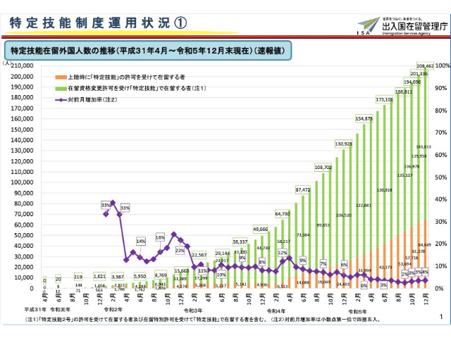 特定技能は下の図の出入国在留管理庁のグラフのように増加しています。外国人採用において特定技能の現在の最新の状況を知る事は重要です。これらの状況を今後の外個人採用戦略の参考にしていただければと思います。